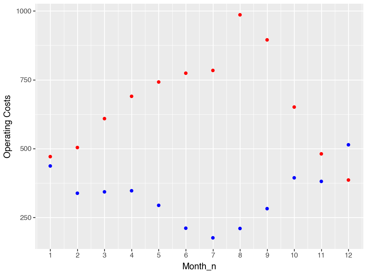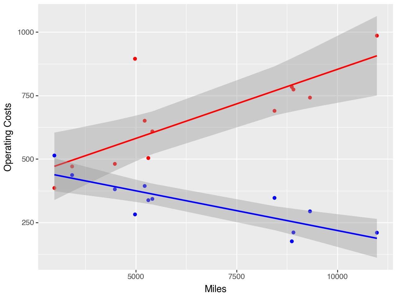 Miles seems to yield a reasonable model of operating costs. Most of the data is close to the line and the distribution seems stable over the observations that we have. The September observation is interesting, we should find out what caused this. Do we this this was a one-time event? Or is there potential that this is an underlying pattern?