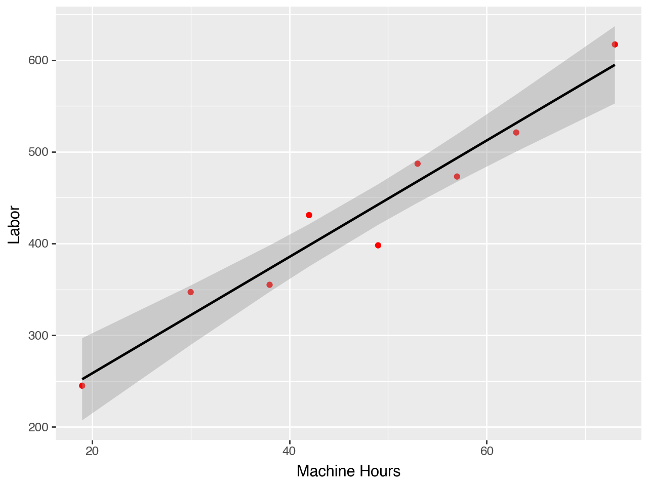 (pn.ggplot( p2df, # this is the dataset# aes allows us to specify the vars/axis pn.aes(x='Machine Hours', y='Labor')) + pn.geom_point(colour="red") # add the data + pn.stat_smooth(method='ols') # add a trendline)