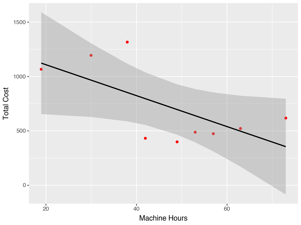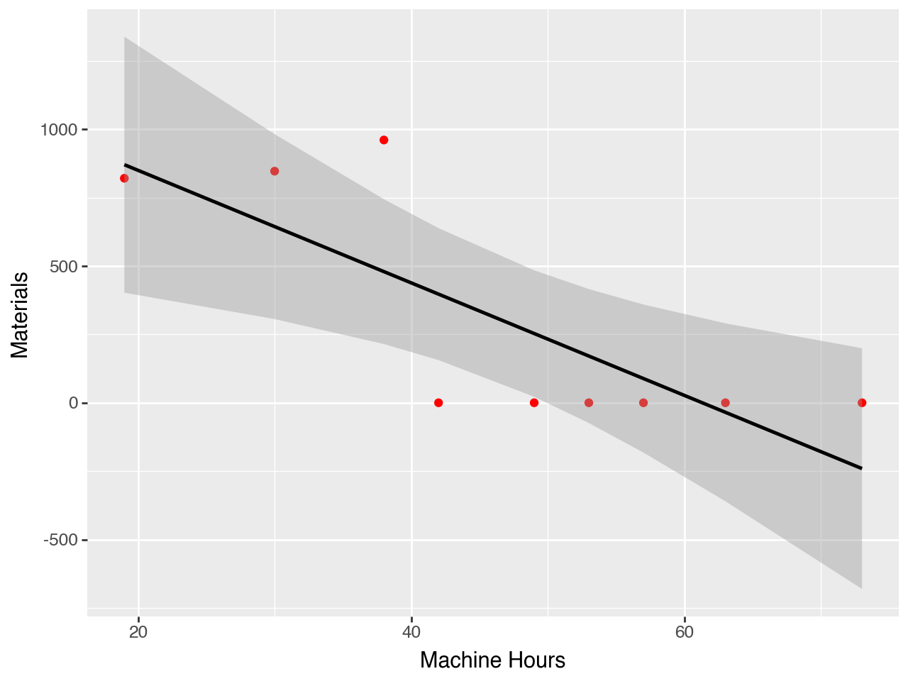 (pn.ggplot( p2df, # dataset pn.aes(x='Machine Hours', y='Materials')) # axis + pn.geom_point(colour="red") # plot the data+ pn.stat_smooth(method='ols') # plot the trend)