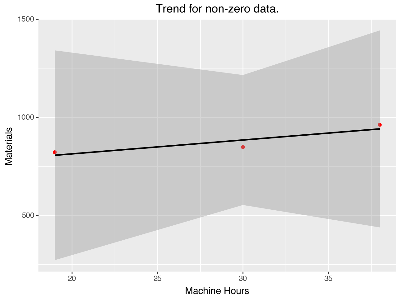 (pn.ggplot(# p2df, # dataset p2df[p2df['Materials']!=0], pn.aes(x='Machine Hours', y='Materials')) # axis + pn.geom_point(colour="red") # plot the date+ pn.stat_smooth(method='ols') # plot the trend+ pn.ggtitle("Trend for non-zero data."))