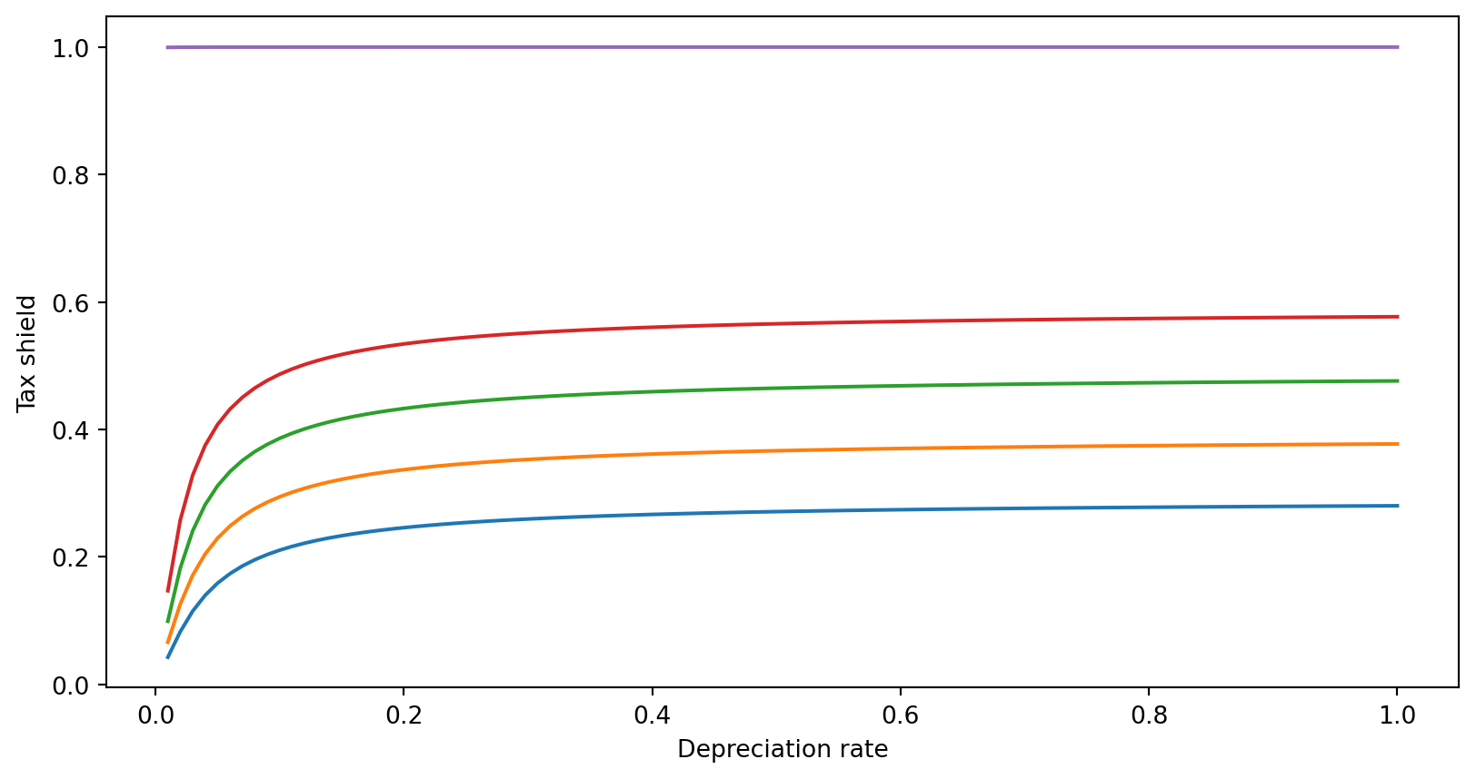 The value of the tax shield as a function as the depreciation rate