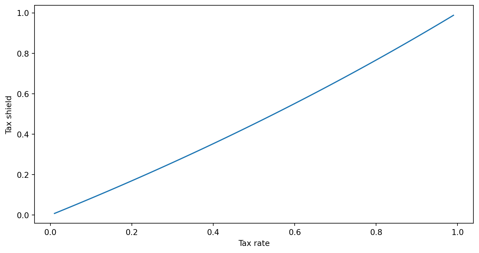 import matplotlib.pyplot as pltimport numpy as npdef tax_shield(d,t,r,x=1): first_term = (d*x*t)/(r*(1-t)) second_term =1-(1+r*(1-t))**(-1/d)return first_term*second_term
